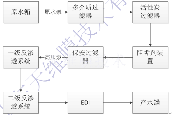 系統(tǒng)先用原水增壓泵將原水送入由多介質(zhì)過(guò)濾器、活性炭過(guò)濾器、加阻垢劑裝置和保安過(guò)濾器的預(yù)處理系統(tǒng),使預(yù)處理產(chǎn)水滿足反滲透進(jìn)水要求,再進(jìn)反滲透除去絕大部分的鹽分,再經(jīng)EDI進(jìn)行深度脫鹽處理,使產(chǎn)水水質(zhì)滿足鍋爐補(bǔ)給水要求。系統(tǒng)工藝流程如下: